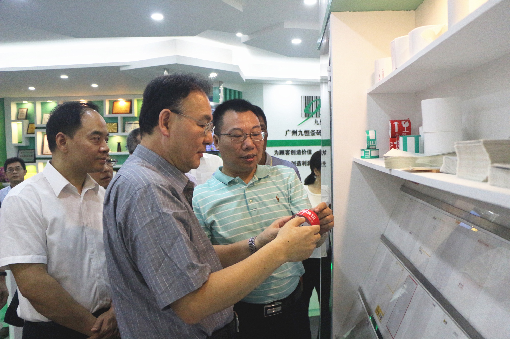 5月31日上午10:30,國家郵政局黨組書記、局長馬軍勝在廣東省郵政管理局周國繁局長、廣州市郵政管理局周建軍局長等陪同下,蒞臨廣州九恒條碼有限公司考察調(diào)研。公司沈云立董事長等高管人員熱情接待了馬局長一行。
